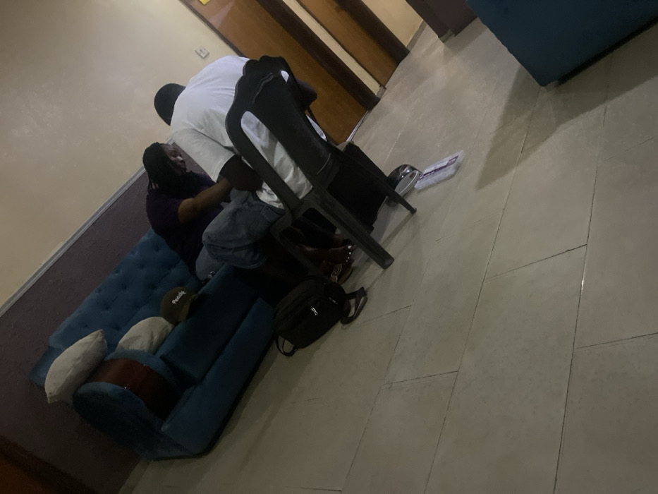 This image depicts an indoor scene in Yenegoa, Nigeria, likely a waiting area or lounge
