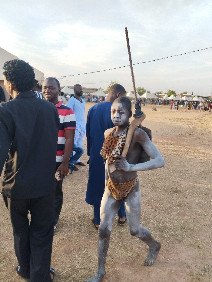The image captures an outdoor daytime scene in Rigasa, Nigeria, depicting a cultural gathering on a dry, light brown field