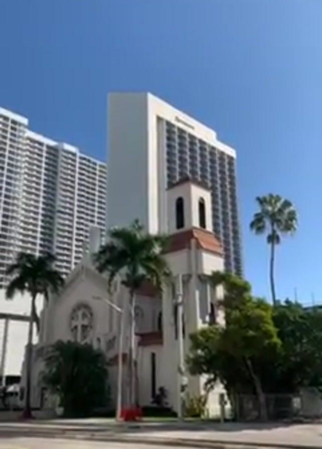 The video captures a low-angle view of a church nestled among tall buildings and palm trees on a bright, sunny day with a clear blue sky. The church is light-colored with red-tiled roofing on its tower. A tall, white building is behind the church, with another high-rise building visible in the background. Palm trees dot the landscape around the church. A dark-colored SUV drives by on the road in front. A man in sunglasses walks in front of the church.