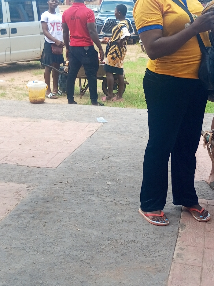 An outdoor scene in Ajalli, Nigeria, depicts five individuals and two vehicles on a paved and grassy surface under daylight conditions. In the immediate foreground, a person is partially visible from the chest down, positioned on the right. This individual wears a yellow short-sleeved top with blue trim, black trousers, and orange flip-flops, displaying light blue nail polish on the toes. A black shoulder bag hangs on their left side. The ground beneath is a mix of textured grey and reddish-brown pavement. In the mid-ground, four individuals are clustered near a patch of grass. From left to right: 1. A woman stands facing forward, smiling slightly. She wears a white t-shirt with "YES" and "USA" text, a dark pleated skirt, and white Adidas slide sandals. A brown shoulder bag is slung over her right shoulder. Next to her, on the ground, is a white lidded plastic bucket containing a yellowish substance. 2. A man stands with his back to the viewer, wearing a red t-shirt and black trousers. He is positioned to the left of a wooden wheelbarrow. 3. A person in a patterned gold and black short dress or tunic stands to the right of the wheelbarrow, facing the man in red. They have their right hand on their hip and wear pink flip-flops. The wheelbarrow, with a single wheel, appears to contain unidentifiable items. In the background, a white passenger van is parked on the far left. Further right and behind the mid-ground figures, a dark-colored SUV is partially visible. Green vegetation is present behind the wheelbarrow and the figures in the mid-ground. A crumpled white object lies on the paved ground in the foreground.