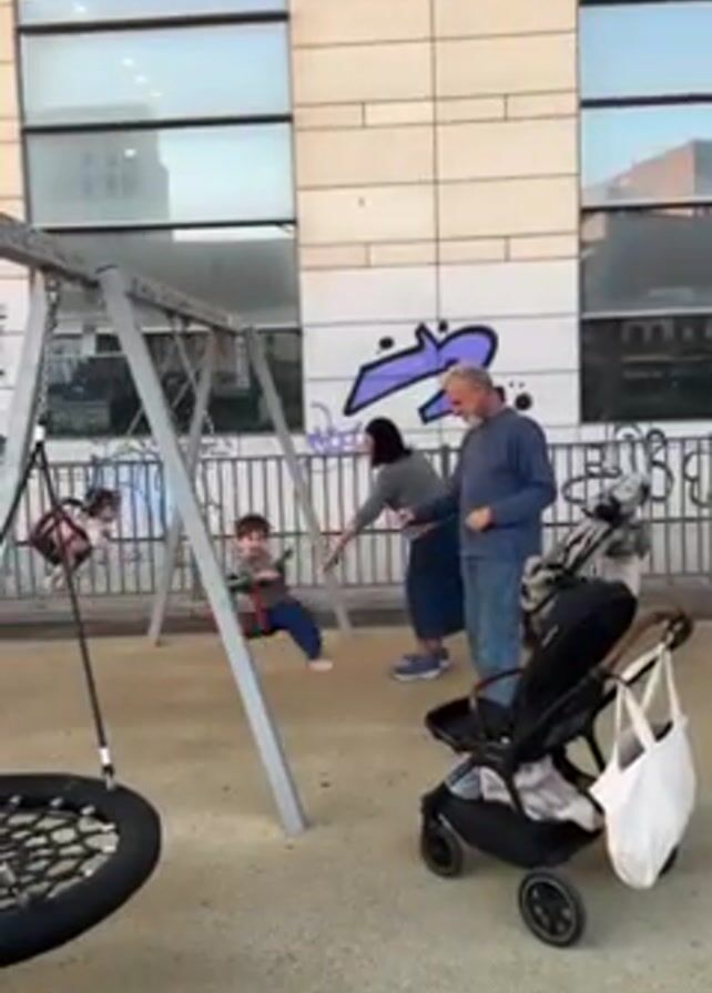 A family consisting of a man, a woman, and two young children are at a playground. The children are on swings. The woman is giving one of the children a push on the swing. The man is standing next to the woman. To the right of the couple is a stroller. Behind the playground equipment is a building with graffiti on the wall. The sky is visible between the buildings.