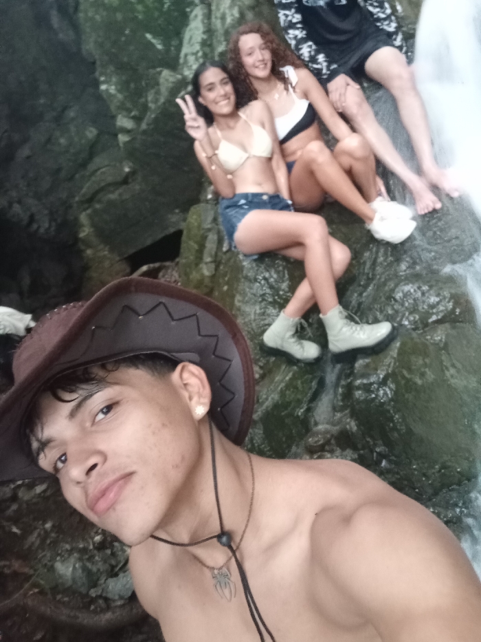 Four young adults are pictured on a rocky waterfall. One individual in the foreground wears a brown cowboy hat, a spider necklace, and is shirtless. Behind, two women are seated in swimsuits and denim shorts. The first woman holds up a peace sign. The second woman has curly hair. A fourth person is partially visible, wearing black shorts, their feet near the waterfall's edge. The setting appears to be a tropical or jungle environment.