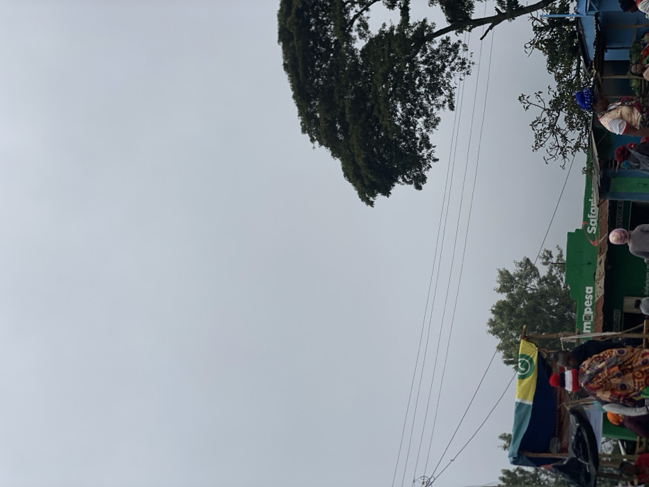 This image captures a street-level scene in a commercial area within Muvuti/Kiima-Kimwe ward, Kenya, under an overcast, grey sky. In the upper right quadrant, a large tree with dense, dark green foliage is prominent. Multiple utility lines traverse the mid-ground horizontally, connected to a pole partially visible on the far left. The lower portion of the image reveals several structures and individuals. On the left, a makeshift stall is present, covered by a blue and yellow tarp. Immediately to its right is a building with a bright green facade and a corrugated metal roof, featuring "m-pesa" and "Safaricom" signage, indicating a mobile money and telecommunications service provider. Another building with a blue facade and corrugated metal roof is partially visible to the right of the green structure. Numerous people are observed in the foreground and mid-ground. A person in the left-center foreground is seen from behind, wearing a patterned garment and a red, white, and blue beanie. To their right, another individual, also facing away, wears a light-colored beanie. Further right, a person with a blue and white patterned head covering and a light-colored, adorned top is visible, standing or interacting within the scene. Other figures are present throughout the lower frame, suggesting a gathering or market activity.