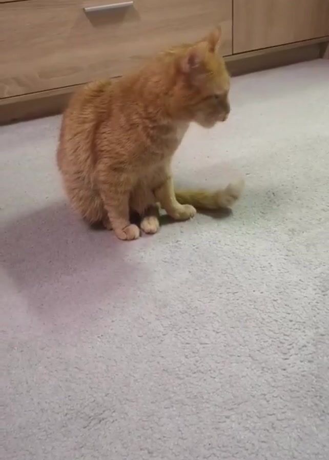 A brief video shows a ginger cat sitting on a gray carpet in front of a wooden dresser