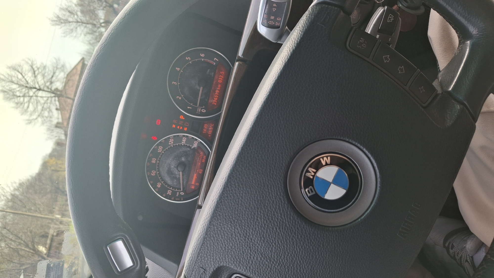 The image depicts the interior of a BMW vehicle from a driver's perspective, located in Kalipetrovo, Bulgaria. The black, textured steering wheel, emblazoned with the BMW logo, prominently features "AIRBAG" at its base and includes multi-function controls on the right spoke. The instrument cluster is visible above the steering wheel, displaying a speedometer and tachometer both indicating zero. The digital display within the cluster shows the time as 14:49, an ambient temperature of +16.5°C, the gear selection in Park (P), an odometer reading of 236519 Km, and a trip meter showing 032.5 Km. Several red warning indicators are illuminated. A fuel gauge indicates the tank is approximately half full. A polished wood-grain trim piece is situated between the steering wheel and the dashboard. Partially visible below the steering wheel are a person's lap, covered by light-colored trousers, and a foot wearing a grey and white athletic shoe. Through the windshield, an overcast sky is visible over a rural or suburban landscape featuring several bare trees and the reddish-brown tiled roof of a building.