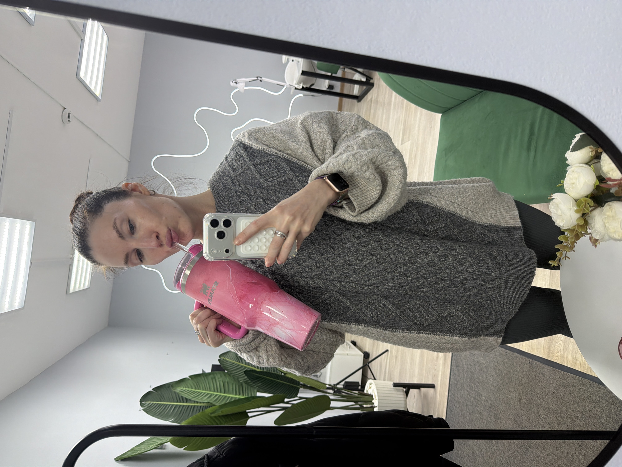 A woman is taking a selfie in a mirror, holding a pink tumbler. She is wearing a gray sweater. The background includes a green chair, a white light fixture, a plant, and artificial flowers. The photo was taken in Perm, Russia.