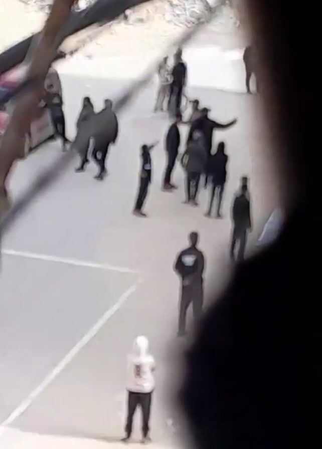 group of approximately 15 people gathered in a paved outdoor area, likely a parking lot or a similar open space. Most of them are wearing dark clothing, including jackets and hoodies, with one individual standing out in a white hooded sweatshirt. The group is generally standing around, with some individuals gesturing or pointing. A person rides a bicycle through the group. A red car is visible parked in the background. The view is partially obstructed by tree branches and what appears to be a window frame or ledge, creating a slightly obscured perspective. The overall impression is that the group is gathering or possibly loitering in a public space.