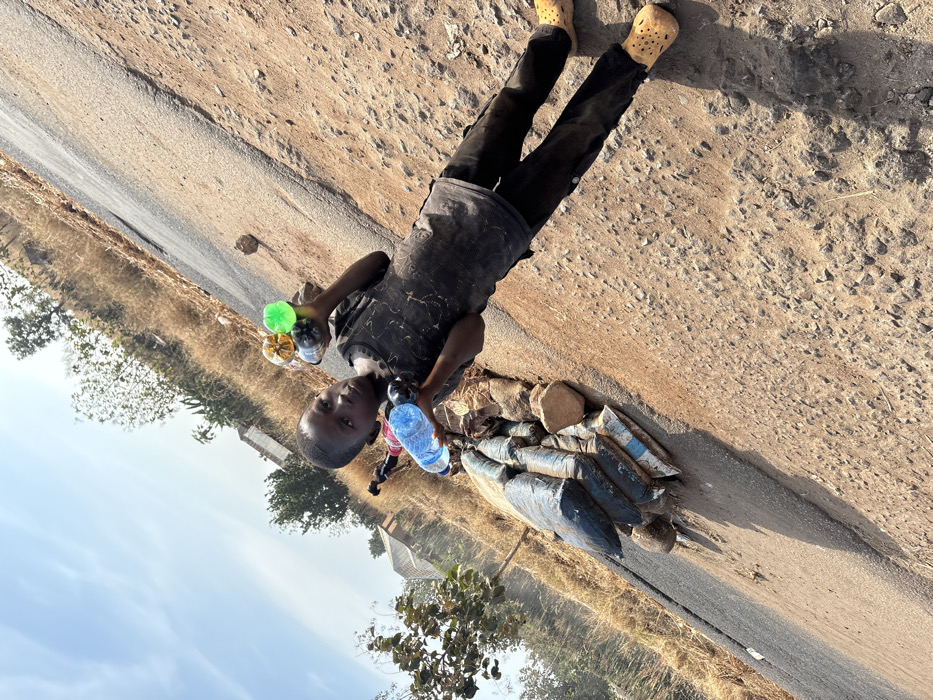 The image displays a young individual standing on the gravel shoulder of a narrow, asphalt road in Gidan Waya, Nigeria. The subject, a child, wears a dark, possibly soiled, short-sleeved top, dark trousers, and yellow perforated clog-style shoes. The child holds a cluster of six plastic bottles: four in the right hand (one green, one yellow, two dark-colored) and two in the left hand (one blue, one dark-colored). All bottles appear to contain liquid. The child is looking directly towards the camera. To the child's left, a stack of dark-colored bundles, resembling sacks or packages, is piled on the ground, intermingled with several rocks. The immediate ground consists of light brown earth and gravel. The background features sparse, dry vegetation and trees under a clear, bright blue sky. Distant structures are visible on the left side of the frame. The scene is illuminated by strong overhead sunlight.