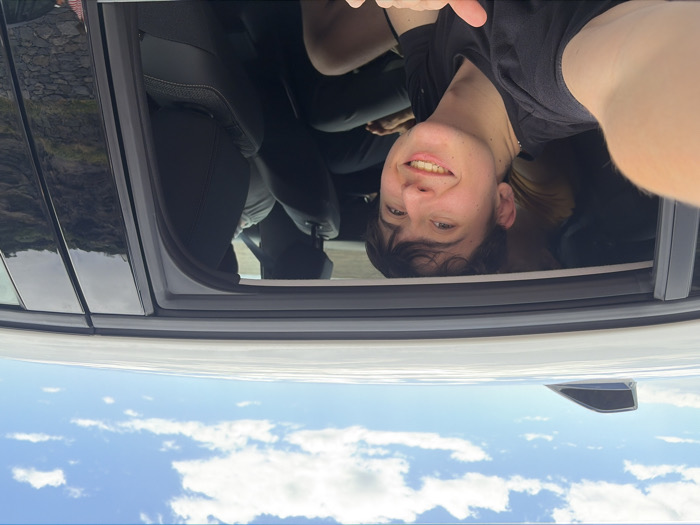 A young male with dark hair, wearing a black t-shirt, is positioned in the rear passenger seat of a white vehicle, looking directly at the camera with a broad smile