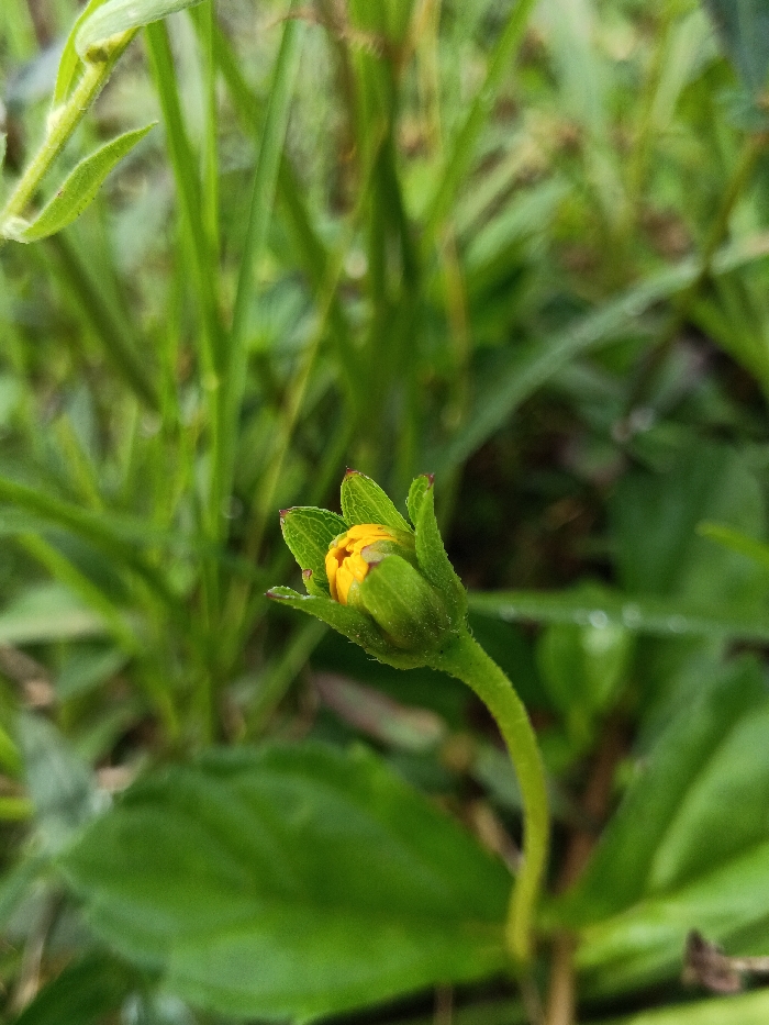 A small, unripe yellow flower bud surrounded by tightly closed green sepals emerges from a slender, curving green stem. It is centered among a bed of lush, green foliage including broad leaves and blades of grass. The scene is natural, suggesting an outdoor environment. Dew drops could be visible on the nearby foliage.