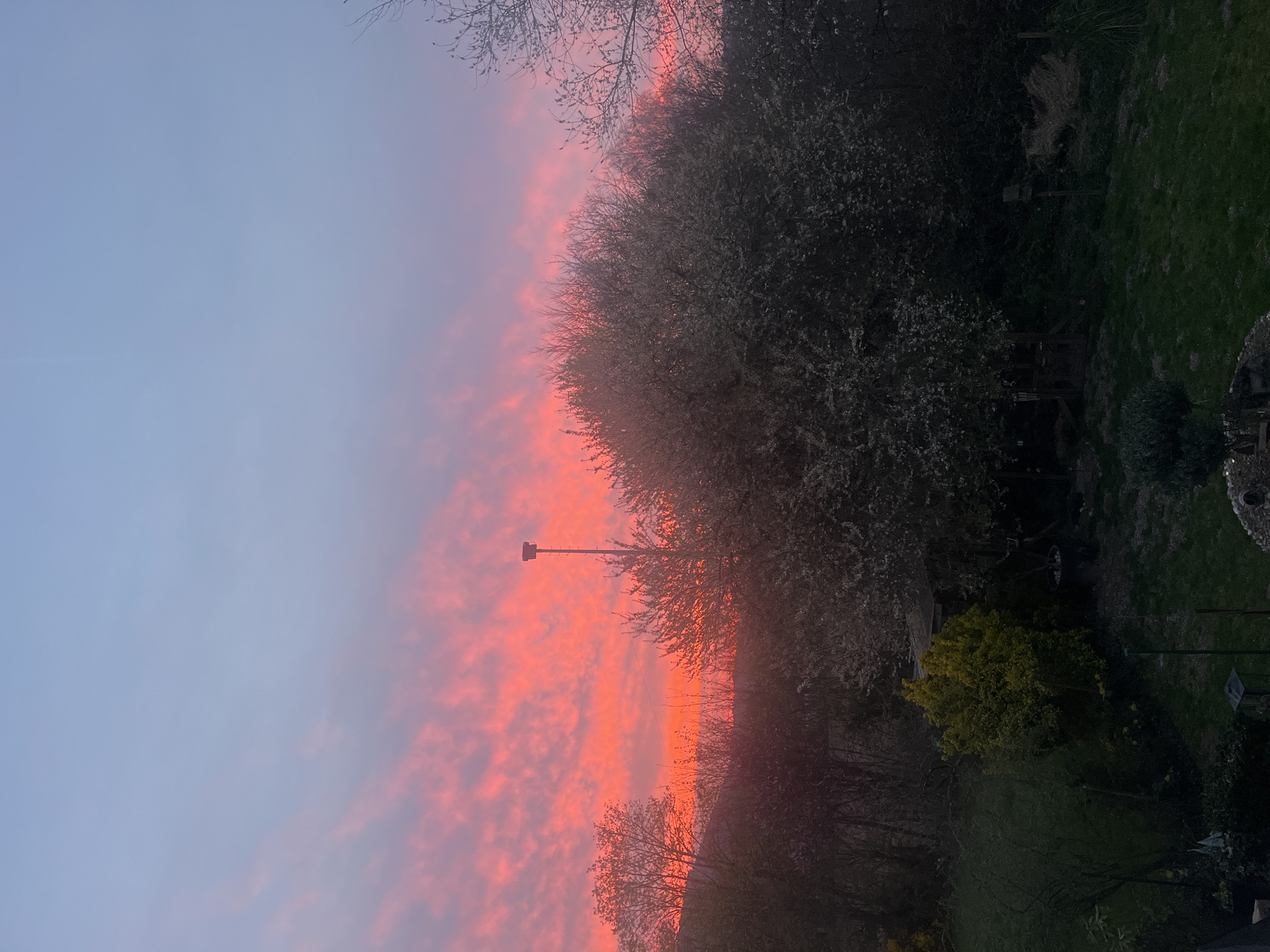 The image displays an outdoor scene captured during twilight in Konz, Germany, characterized by a dramatic sunset. The upper sky is a pale blue transitioning to light grey, while the middle and lower portions are dominated by intense red and orange hues, illuminating scattered clouds. In the midground, a dense line of trees and bushes forms a dark silhouette against the vibrant sky. Many of these appear to be deciduous trees or shrubs, some exhibiting white blossoms. A prominent, tall, slender pole with a dark, square-topped fixture (possibly a birdhouse or sensor) stands slightly right of the image's vertical center, silhouetted against the sunset. Below the horizon line, the dark forms of distant hills or a ridge are faintly visible. The foreground consists of a cultivated garden or lawn area. Green grass covers the ground, and various shrubs are visible, including a brightly lit yellow-green shrub located to the left of the lower center. Other dark garden elements, such as smaller plants and obscured features, are present along the bottom edge. No people or discernible activities are observed within the frame. The lighting conditions suggest a low sun, providing strong backlighting and high contrast.