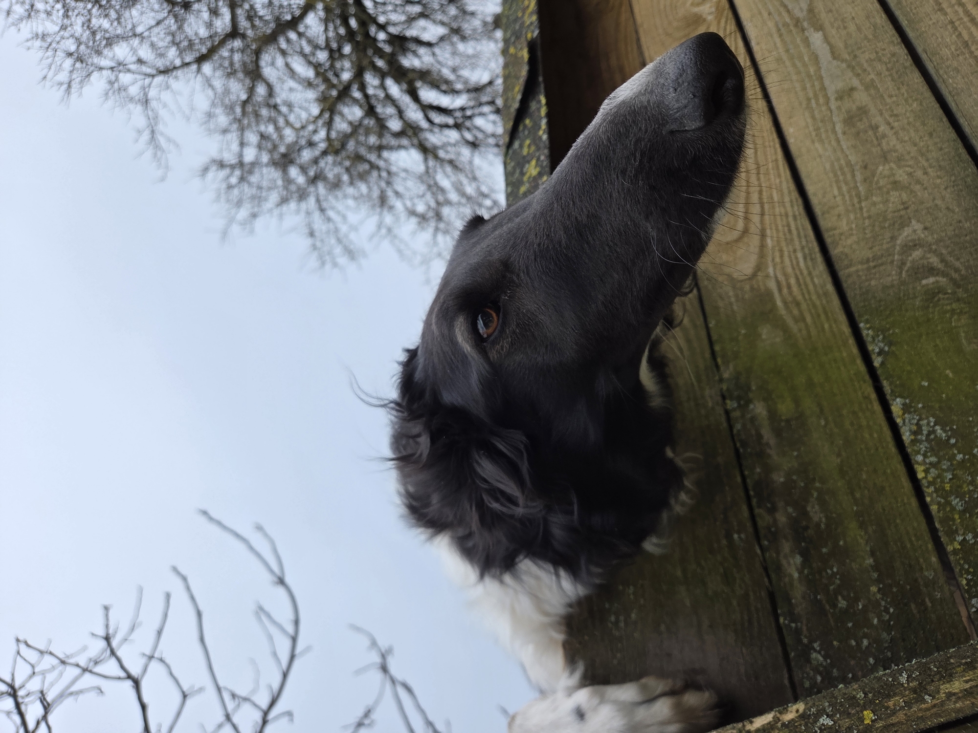 A black and white Borzoi dog is prominently featured, leaning over a weathered wooden fence or enclosure. Its long, dark muzzle, black nose, and visible amber-colored right eye are in sharp focus. White fur is visible on the dog's left shoulder area, and at least one white paw rests on the wooden structure to the left. The wooden planks of the structure are horizontal and show patches of green and yellow lichen or moss. The background consists of a light grey, overcast sky. Bare tree branches are visible against the sky, with sparser branches on the left and a denser, out-of-focus tree canopy on the right. Below the right-side tree, a partial view of a weathered roof with similar lichen growth is present. The scene is located in Neofit Rilski, Bulgaria.