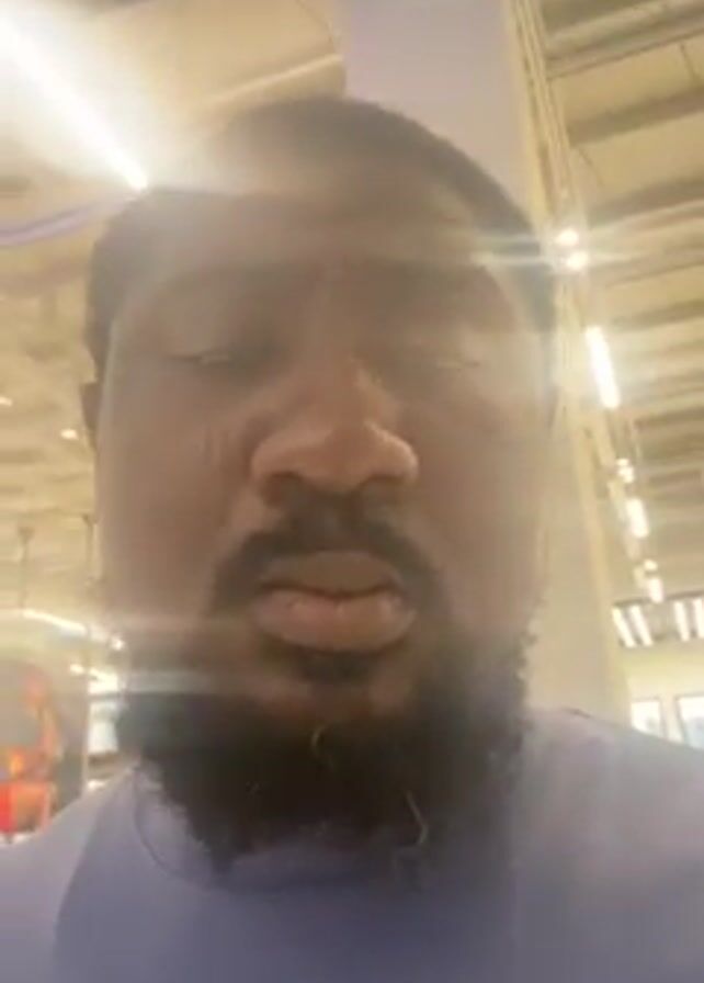 The video features a man with dark hair and a beard looking directly into the camera. He is wearing a light blue t-shirt and is in what appears to be a store. Overhead, there's a sign with the Adidas logo and the letters "LAG" visible. The store has bright overhead lighting. The man has a serious expression on his face throughout the video.