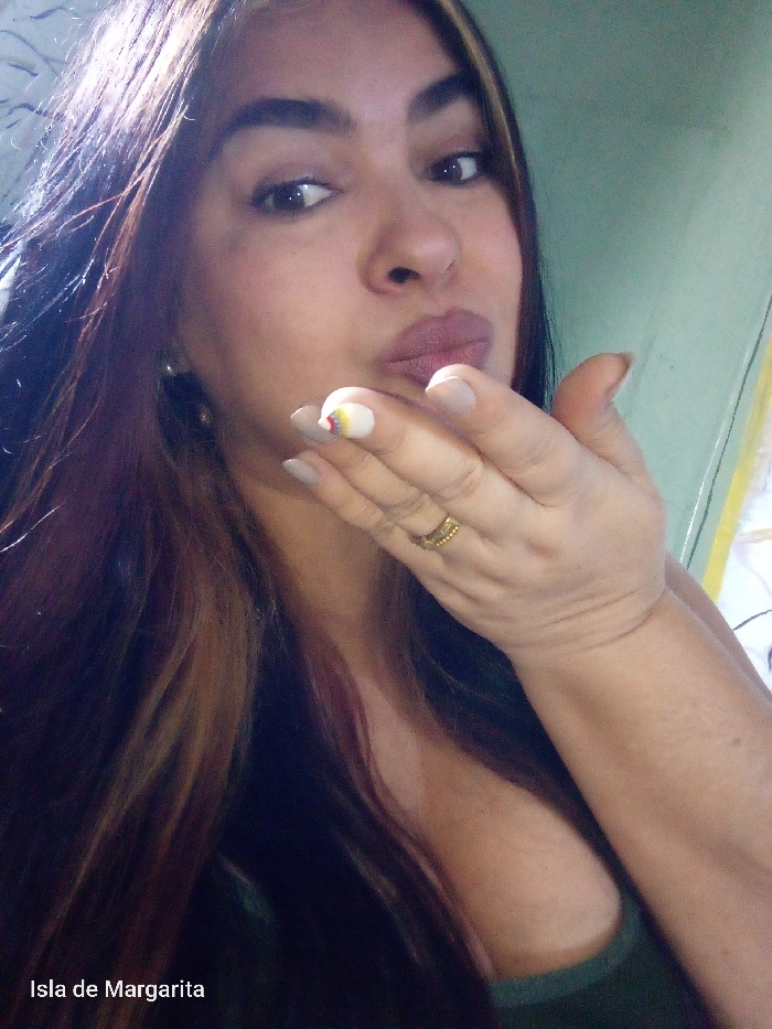 A woman with long, dark hair and a blonde streak poses for a selfie, blowing a kiss towards the camera. She has light skin, arched eyebrows, and full lips. She wears a gold ring on her finger and has a manicure with one nail featuring a colorful design. The backdrop is blurry, suggesting an indoor setting. "Isla de Margarita" is subtly printed at the bottom left.