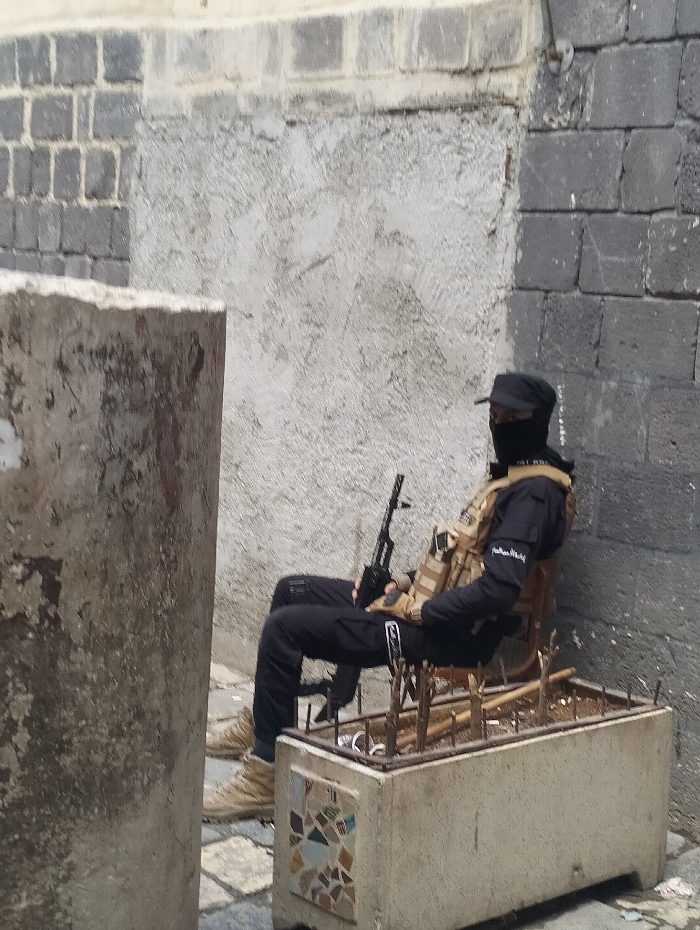 An armed male individual is depicted seated in a narrow urban alleyway. He is positioned against a wall composed of dark grey cinder blocks in the upper and right sections, and a lighter, rough-textured concrete or stucco wall to the left, topped with a light-colored coping. The individual wears a black baseball cap, a black face covering, a black long-sleeved shirt, black trousers, and tan combat boots. Over his shirt, he wears a tan tactical vest equipped with multiple pouches. Arabic script, identified as "ولاية الشام" (Wilayat al-Sham), is visible on his right sleeve. He holds a black rifle, consistent with an AK-variant, in his left hand, resting it across his lap. He sits on a makeshift structure, possibly a chair frame or plank, placed over a rectangular concrete planter box. This planter box features a mosaic of colored tiles on its front, contains soil, and has several bare branches or sticks and metal rods protruding from it. The ground is paved with irregular grey cobblestones or flagstones. A large, weathered concrete pillar is partially visible in the left foreground. The setting is consistent with an urban area within Damascus, Syria.