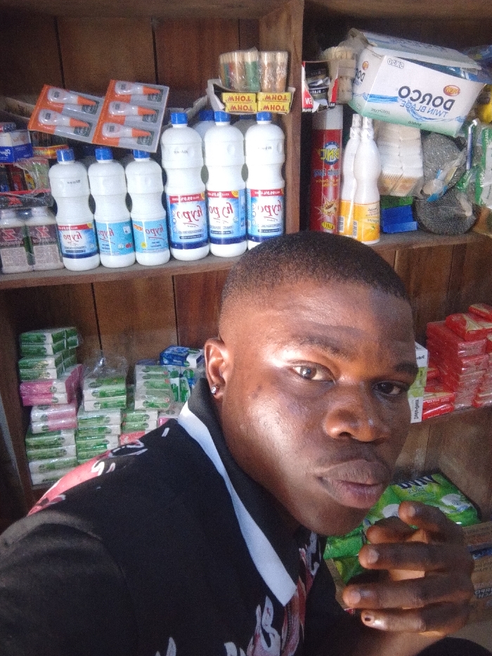A young adult Black male, approximately 20-30 years old, with short, dark, neatly trimmed hair and a small silver-colored stud in his left earlobe, looks directly into the camera. He wears a black polo shirt with a white collar and a patterned design on the upper chest. His right hand is visible in the lower foreground, with fingers slightly curled; dark nail polish is present on his pinky finger. The individual is situated within a small retail establishment or shop in Zango-ndaji, Nigeria. Behind him, wooden shelves display various consumer products. The top shelf on the left holds blister packs containing multiple small, white, and orange-tipped items, likely toothbrushes. The middle shelf prominently features a row of at least seven white plastic bottles with blue caps, labeled "Topbo," alongside a red aerosol can, other white bottles with yellow labels, plastic cups, and a boxed "DORCO TWIN BLADE" razor product. The lower shelf on the left is neatly stacked with multiple rectangular packs of individually wrapped items, likely soap or tissues, in pink, green, and blue packaging. Additional packaged goods in green and red wrappers are visible on the lower right. The environment is adequately lit, suggesting an active commercial setting.