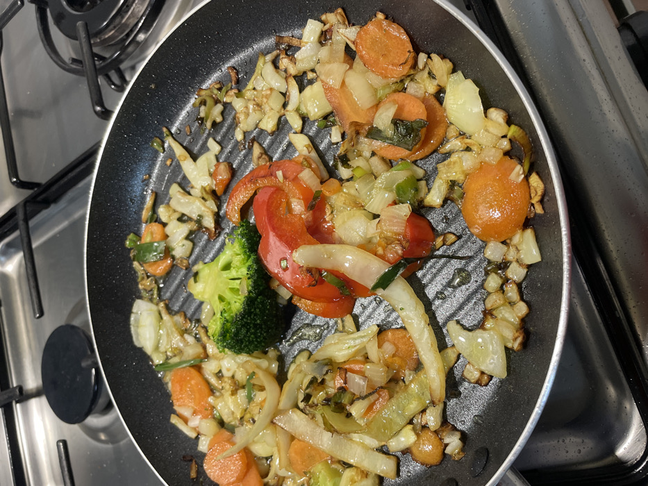 - "The image displays a close-up, high-angle view of various sautéed vegetables in a black non-stick grill pan, positioned on a stainless steel gas hob" by FM-Dnkxt1, licensed under CC BY 4.0
