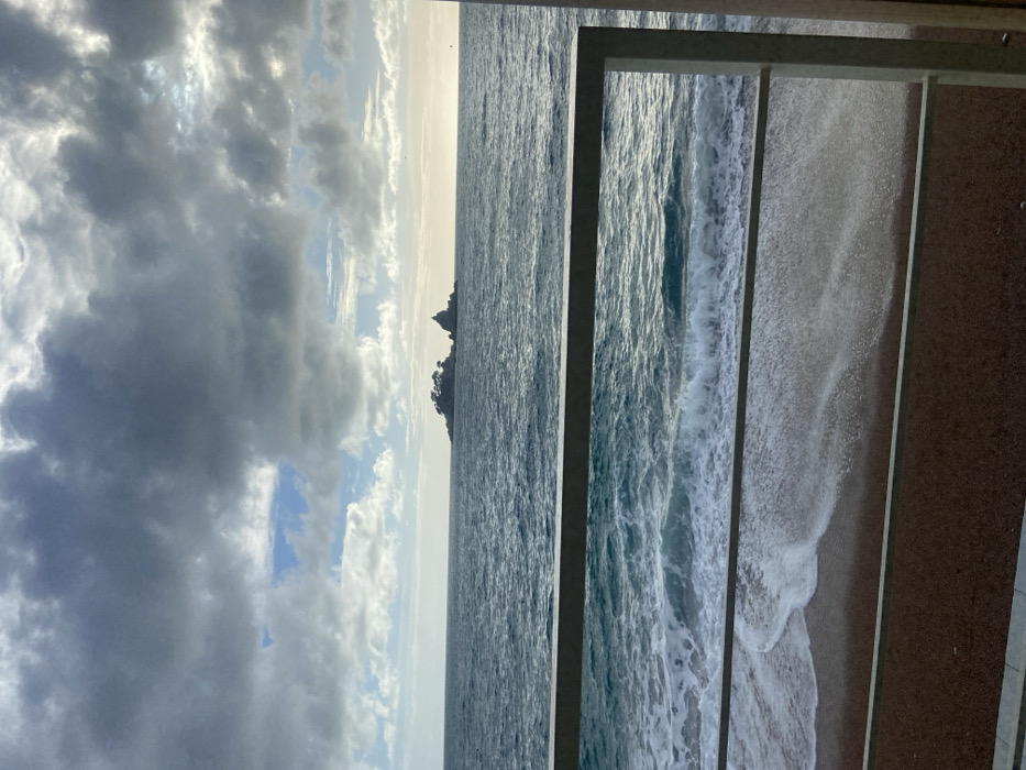 The image depicts a coastal scene in Petrovac centar, Montenegro, observed from an elevated perspective, likely a balcony. In the immediate foreground, a light-colored metallic railing, consisting of a top bar, two horizontal intermediate bars, and vertical supports, bisects the lower half of the frame. Below the railing, a reddish-brown pebbled beach is visible, with white foam from receding waves extending onto the shore. The sea occupies the midground, characterized by choppy, dark turquoise-blue water with discernible waves. In the distance, two small rocky islands are situated on the horizon. The left island is larger and features several small trees or shrubs at its summit. The right island is smaller, conical in shape, and appears to have a small structure, possibly a chapel, on its peak. The sky above is largely overcast with dense, dark grey clouds, though patches of lighter clouds and some areas of blue sky are visible, particularly towards the left horizon. Sunlight partially breaks through the clouds on the far right horizon, casting a faint glow. No individuals are present in the scene.