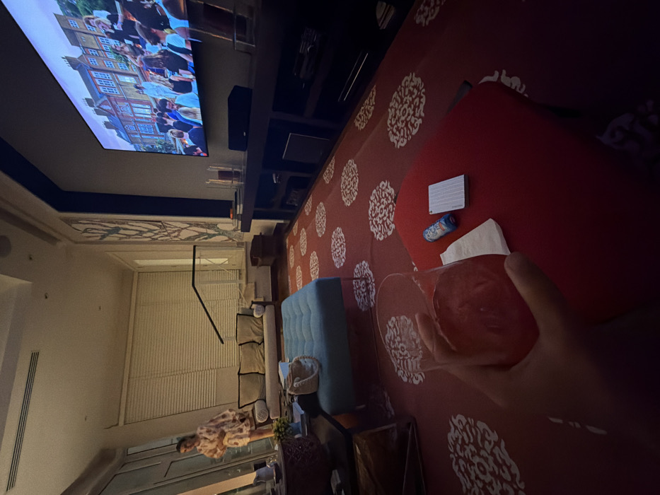 The scene depicts an interior living space in La Romana, Dominican Republic, viewed from a low perspective. The room is dimly lit, suggesting evening. In the immediate foreground, a human hand holds a clear glass containing a reddish liquid with ice. This hand rests above a low, square, red ottoman or table. On this red surface, a small white napkin, a blue and white cylindrical item (possibly a can), and a stack of small white notepaper are visible. The floor is covered by a red carpet featuring a repeating white circular or floral pattern. Centered in the mid-ground is a rectangular ottoman upholstered in light blue or teal fabric with metal legs. To the left, a dark-colored rectangular coffee table is partially visible. In the background on the left, a female figure stands near a large window or glass door fitted with horizontal blinds. She is wearing a light-colored, patterned dress or robe. Behind her, a neutral-toned sofa with throw pillows is placed against the wall beneath the blinds. A black, abstract, minimalist wall decoration is mounted to the right of the blinds. Along the right wall, a long, dark-colored media console holds a large flat-screen television, a soundbar positioned centrally, and other electronic devices within its shelves. The television screen displays a scene featuring numerous people, primarily young adults, gathered outdoors in front of brick buildings, consistent with a movie or television show. The walls are light-colored, and a decorative panel with a muted, abstract branch-like pattern is visible between the window area and the television.