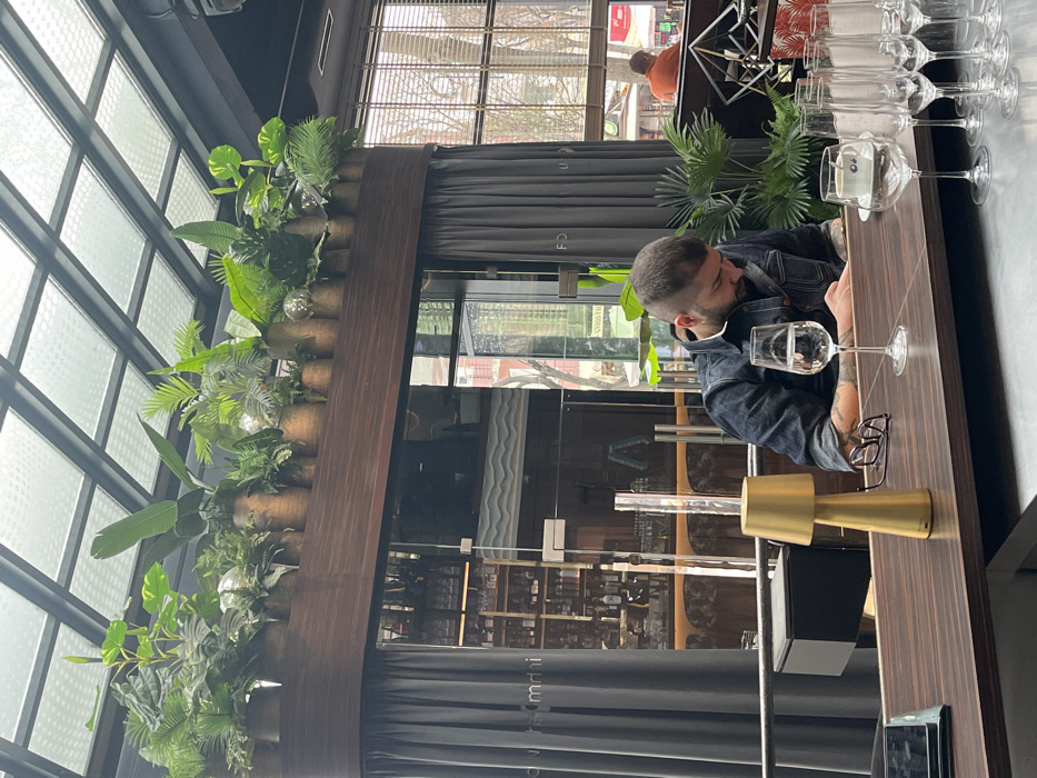 The image displays the interior of Food & Fusion, a restaurant located in Varna, Bulgaria. A male individual with a trimmed beard, dark hair, and visible arm tattoos is seated at a dark wood-grained counter, wearing a dark denim jacket and looking downwards. On the counter, to his left, are a golden conical table lamp, a pair of black eyeglasses, and a stemmed glass containing clear liquid. To his right, multiple empty champagne flutes are arranged. Above the seating area, a wooden bulkhead supports a row of bronze cylindrical planters filled with diverse green artificial plants and two reflective spherical ornaments. The ceiling consists of a grid of large glass panels. Dark gray curtains, partially displaying the word "FOOD," flank glass windows that offer a view of an urban exterior. This exterior includes bare trees, distant building facades, a partially visible person in an orange shirt, and a street sign bearing the text "GYROS VAL." Reflective glass surfaces within the interior reveal a stocked bar area.