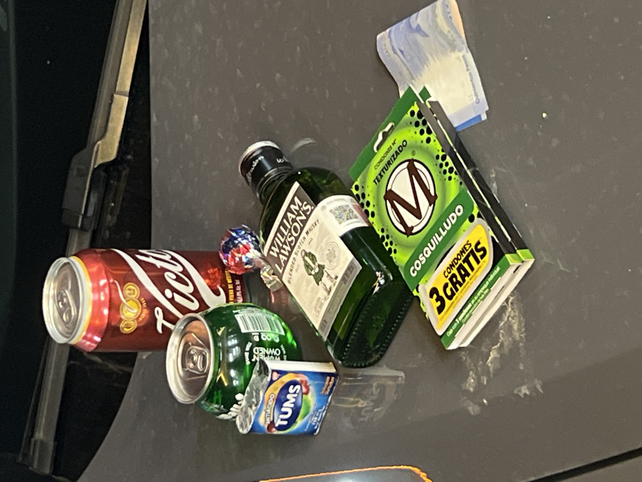 A cluttered car hood displays a haphazard collection of items. There's a can of Lipton Iced Tea, a crushed green soda can, a roll of Tums antacids, a lollipop, a bottle of William Lawson's Scotch Whisky, and a pack of textured "M" brand condoms. The windshield wiper arm is visible on the left, and a stack of tissues sits near the condoms on the right. The items appear scattered, possibly after a spontaneous gathering or quick stop.