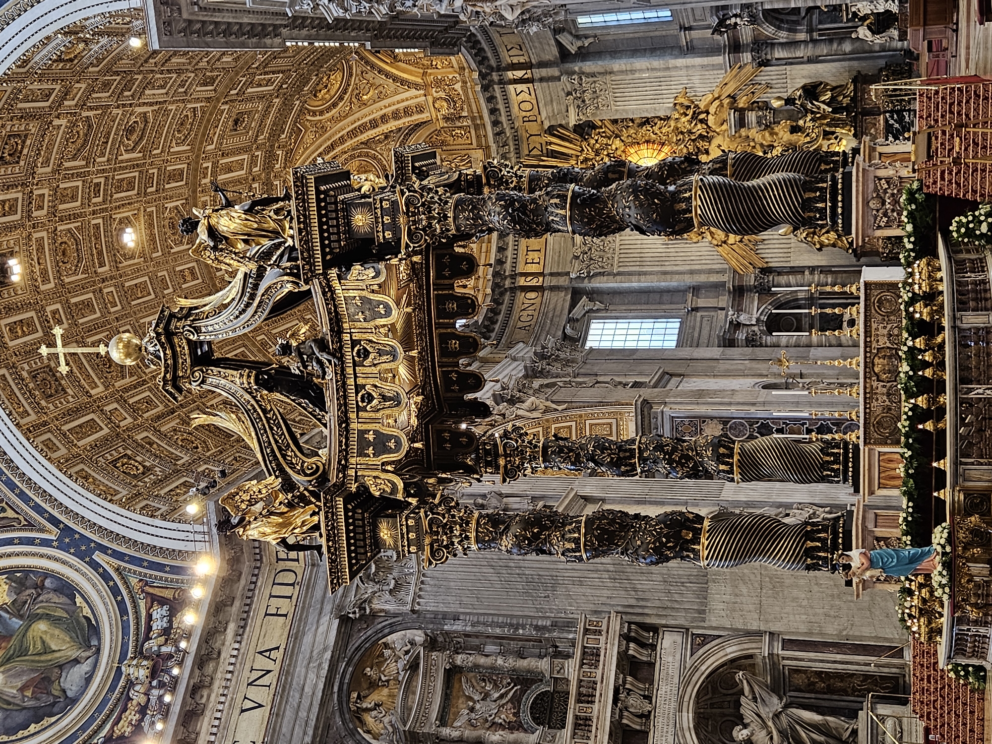 This is an interior shot of St. Peter's Basilica, located in Vatican City, Italy. The camera points upwards, showcasing the intricate architectural details of the basilica, including the dome and various sculptures. The focus is on the baldachin designed by Bernini, a large bronze structure situated over the main altar. The baldachin has dark, twisting columns adorned with golden ornamentation. Above it, there's a golden structure topped with a golden cross and globe. The Basilica's interior is highly ornate, with inscriptions, statues, and paintings visible on the walls and ceiling. Light fixtures are placed near the inscriptions. The ceiling features intricate patterns and designs in gold.