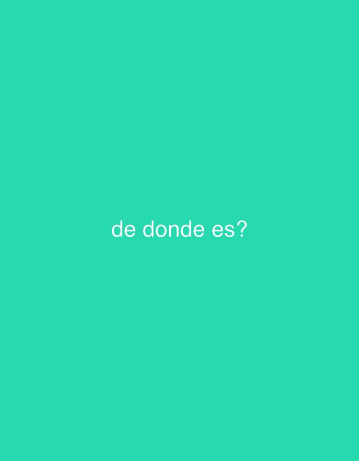 The image displays a solid, uniform teal-colored background. Centered horizontally and vertically on this background is the text "de donde es?", rendered in white, sans-serif font. There are no discernible people, subjects, objects other than the text, actions, or interactions present within the image. The environment is entirely a monochromatic digital surface. No visual cues or contextual elements are present to indicate a specific location in the city of Madrid, Spain, or any other geographical location.