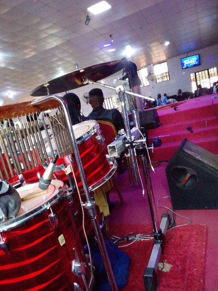 This image depicts the interior of a large hall in Maigizo, Nigeria, configured as an event or worship venue. The foreground is dominated by a transparent red drum kit with chrome hardware, including a tom and a snare drum. A microphone on a stand is positioned over the snare drum, where drumsticks are visible beneath a gray cloth. A set of bar chimes is mounted on a stand to the left of the drums, and a large, dark cymbal is partially visible above. To the right, a black stage monitor speaker rests on a red carpet. Electrical cables and audio cords are visible on the carpeted floor. The midground features a raised stage covered in red carpeting, accessed by red steps. Two individuals are seated near the drum kit, viewed from behind; one has dark braided hair, and the other wears a dark vest over a light-colored garment. Further back on the stage, a person in a dark jacket and light trousers stands behind a clear lectern, facing away from the viewer. Several other individuals are seated in red-upholstered chairs on the stage. The background shows more seating areas with people, indicating an audience or congregation. The far wall features multiple rectangular windows, providing ambient light, and two wall-mounted fans. A television screen on the far right displays blue text and graphics. The ceiling is white with multiple square light fixtures.