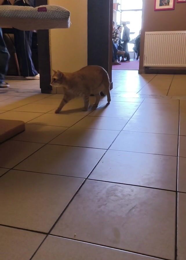 ginger cat walking through an indoor space. The camera is positioned low, near the floor, capturing the cat's movement. Initially, the cat walks from a doorway into a tiled hallway with a radiator and pictures on the wall. It then moves past a cat tree and a wicker cat bed. The scene transitions to a room with tables, chairs, a carpet, and a wall with a tree painted on it. The cat moves among the tables where people are sitting.