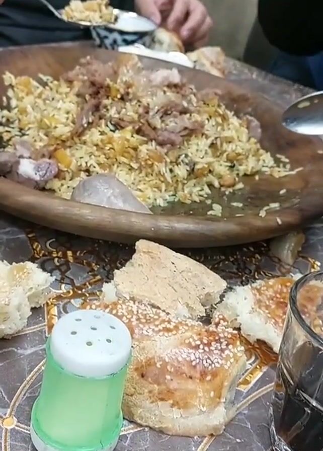 The camera provides a close-up view of a table set for a meal, with several individuals seated around it. In the center of the frame is a large wooden platter filled with plov, a traditional dish of rice, meat, and vegetables. Two spoons are visible, indicating that people are actively eating the dish. Surrounding the platter are pieces of flatbread, a salt shaker, and a glass filled with dark liquid, possibly cola or tea. To the side, there is a decorative blue and white teapot with gold accents, and a bottle of Coca-Cola. A plate of sliced tomatoes is also visible. The table has a marble-patterned surface. In the background, individuals are discernible, though the focus remains on the food and the immediate table setting. The overall scene suggests a shared meal in a casual setting.