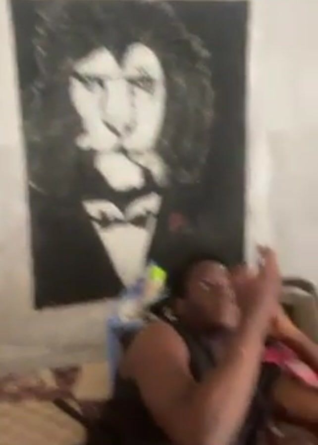 interior of a room. Initially, a man is lying on a bed, using his phone. A large black and white drawing of a lion in a suit is on the wall behind him. There is a blue plastic stool next to the bed with a few items on it. A suitcase is on the floor next to the bed. The camera moves to show another man standing near a window, also using a phone. The room appears sparsely furnished and unfinished, with plain walls.