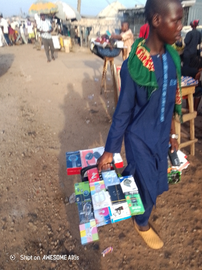 The image captures an outdoor scene in Lokoja, Nigeria, depicting a bustling street or market environment during daylight. A young male, the primary subject, walks from right to left across the frame, looking towards the right. He wears a dark blue long-sleeved tunic with light blue embroidery, tan quilted shoes, and has a green and patterned fabric draped over his left shoulder. A silver-colored wristwatch is visible on his left wrist. In his right hand, he carries a black carrier frame displaying numerous brightly colored, packaged electronic items, including what appear to be earphones, smartwatches, and other accessories. His left hand holds a black object and some papers. The ground is an unpaved, light brown dirt path with scattered debris. In the blurry background, multiple individuals and makeshift stalls are present. A man in a patterned shirt walks away to the left. Further back, another individual attends to a stall with items, positioned near a dark blue bowl on a wooden stand. Other indistinct figures and market structures, including umbrellas and awnings, line the background.