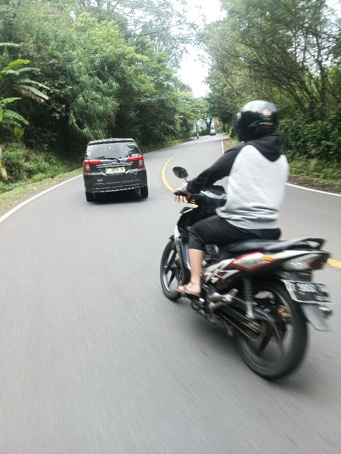 The image depicts a rural road in Domphoog_Dungkarchhoeling, Bhutan. A person, viewed from the back, is operating a black and white scooter-style motorcycle in the immediate foreground, moving forward on a paved asphalt road. The individual wears a black helmet, a grey and black hooded long-sleeve top, dark shorts, and light-colored flip-flops. Ahead of the motorcycle, a dark grey SUV, possibly a Toyota Avanza, travels in the same direction. The SUV displays a rear license plate with "F 1373 ZG". The road, which curves to the right, is marked with a solid yellow line on its right edge and a solid white line on its left edge. Dense green foliage, including large-leafed plants, lines both sides of the road, suggesting a heavily vegetated environment. The sky above is overcast. Both vehicles exhibit motion blur, indicating active movement along the road.