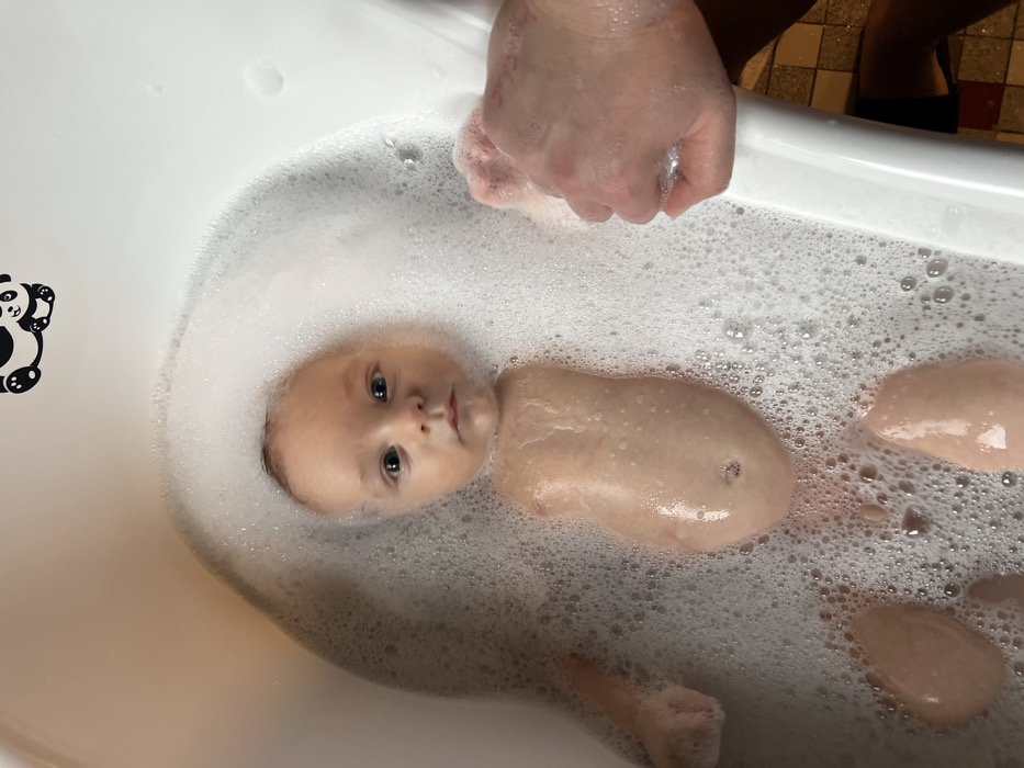 - "A baby lies in a white, bubble-filled bathtub" by FM-YPNSq2, licensed under CC BY 4.0