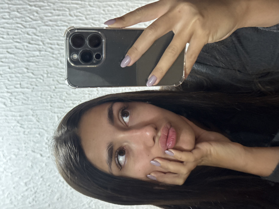 A young woman takes a selfie. She looks up to the left with slightly parted lips. Her left hand is near her face. She's holding a phone in her right hand with the camera pointed towards her. The phone has three visible lenses. Her fingernails are painted a light purple. The background is a textured white surface. The woman is wearing a dark-colored shirt. Her hair is dark and long.