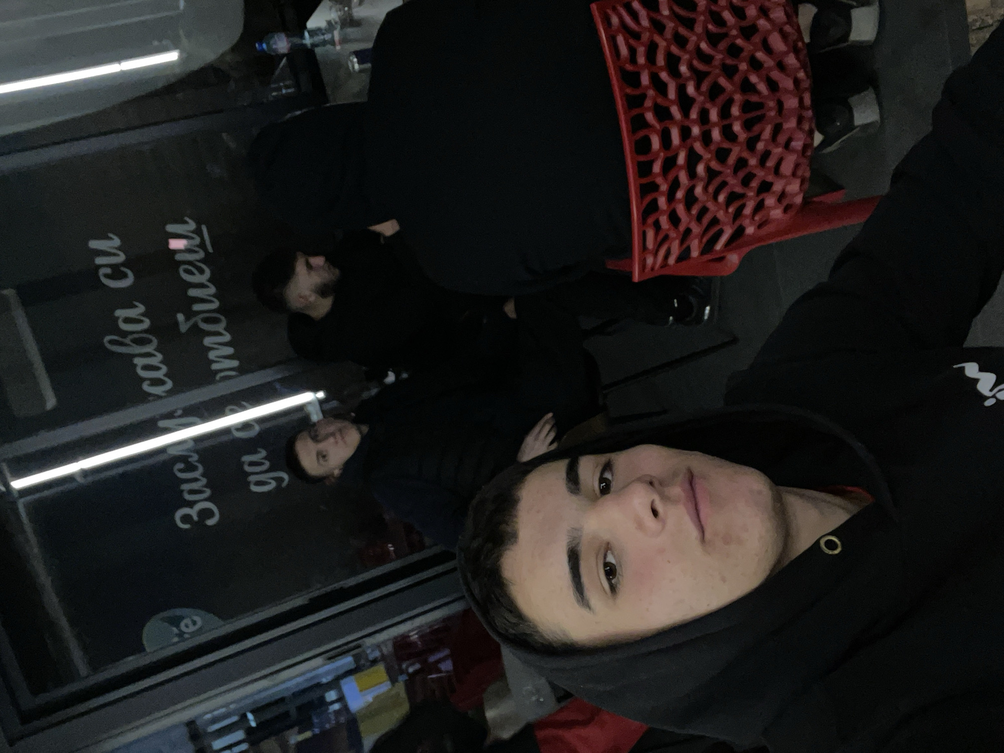 This image captures an indoor scene, likely a cafe or bar, at night or in low-light conditions, situated in Karlovo, Bulgaria. The scene features four young males. In the immediate foreground, a male with short dark hair, brown eyes, and facial blemishes takes a selfie, looking directly at the camera. He wears a black hooded sweatshirt with a visible gold grommet near the neckline and a red lining. Behind him, to the left, a second male with short dark hair is seated, wearing a dark jacket, looking towards the left of the frame. To the right of the second male, a third male with short dark hair and a beard is partially visible in profile, wearing a dark shirt and looking downwards. Further to the right, a fourth male is seated with his back to the camera, wearing a black hooded sweatshirt. He occupies a red chair with a distinctive patterned backrest. His feet, clad in dark sneakers with white soles, are visible beneath the chair. On a dark table in the mid-ground, a clear plastic bottle of water and a silver-colored beverage can are present. The background features a dark glass panel or window displaying white Cyrillic text, which translates to "It's worth stopping by" or "It's worth dropping by," confirming a Bulgarian-speaking environment. Artificial strip lighting is visible through this panel. The overall lighting is dim. No direct interactions between the background individuals and the selfie-taker are discernible; they appear to be co-occupying the space.