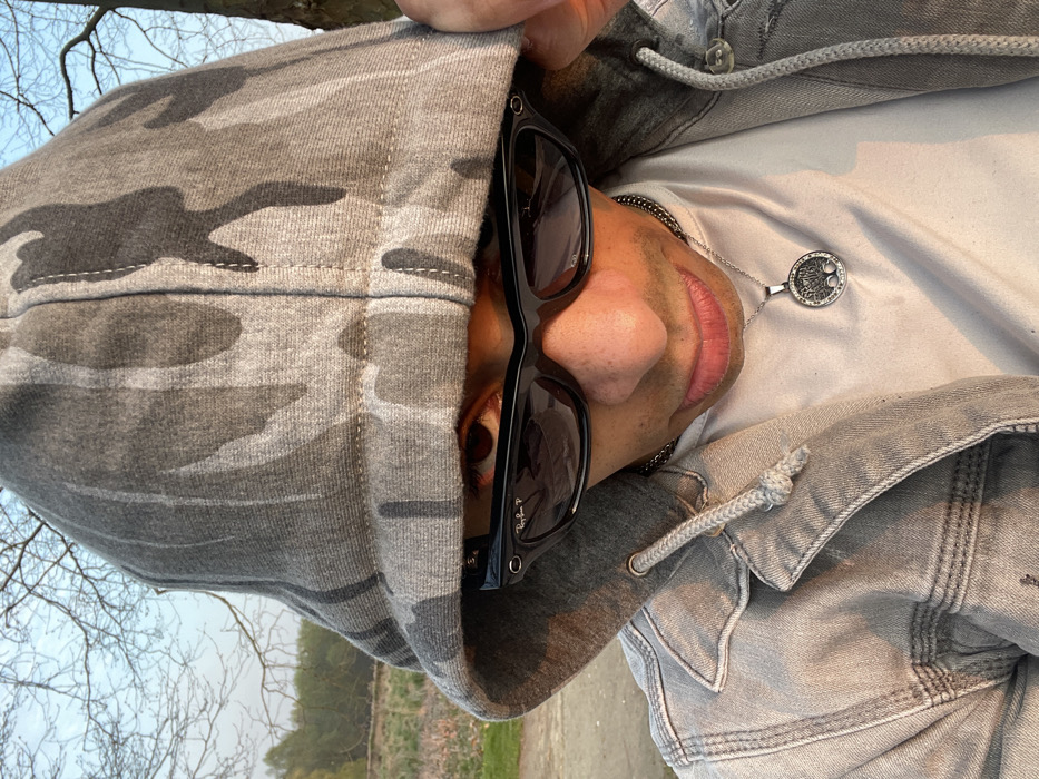 A close-up, eye-level portrait depicts a male subject outdoors in Plaisir, France. The subject is wearing a grey camouflage-patterned hoodie with the hood up, black Wayfarer-style Ray-Ban P sunglasses, a grey denim jacket, and a white t-shirt. A silver-toned chain with a circular pendant, featuring a central emblem and perimeter embellishments, hangs from the subject's neck. The subject's left hand is partially visible near the side of the hood. Warm, soft light illuminates the subject from the right. The background consists of a dirt path, green foliage, and bare trees against a light blue sky, indicative of an open natural area.