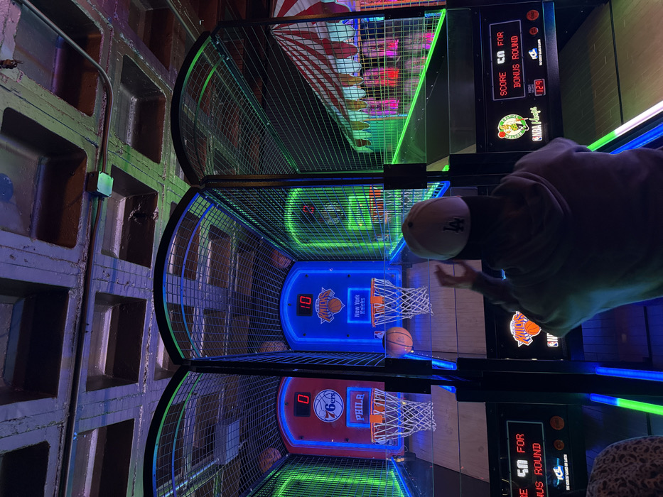 basketball arcade game. The game features hoops with team logos: Philadelphia 76ers and New York Knicks. The score displays “0” for Philadelphia and “10” for New York. The screen shows “Score 50 for Bonus Round” and a score of 129. An individual in a hat throws a basketball towards the Knicks hoop. The game features neon lighting and a protective cage around each hoop. The surrounding wall is textured and illuminated with green light.