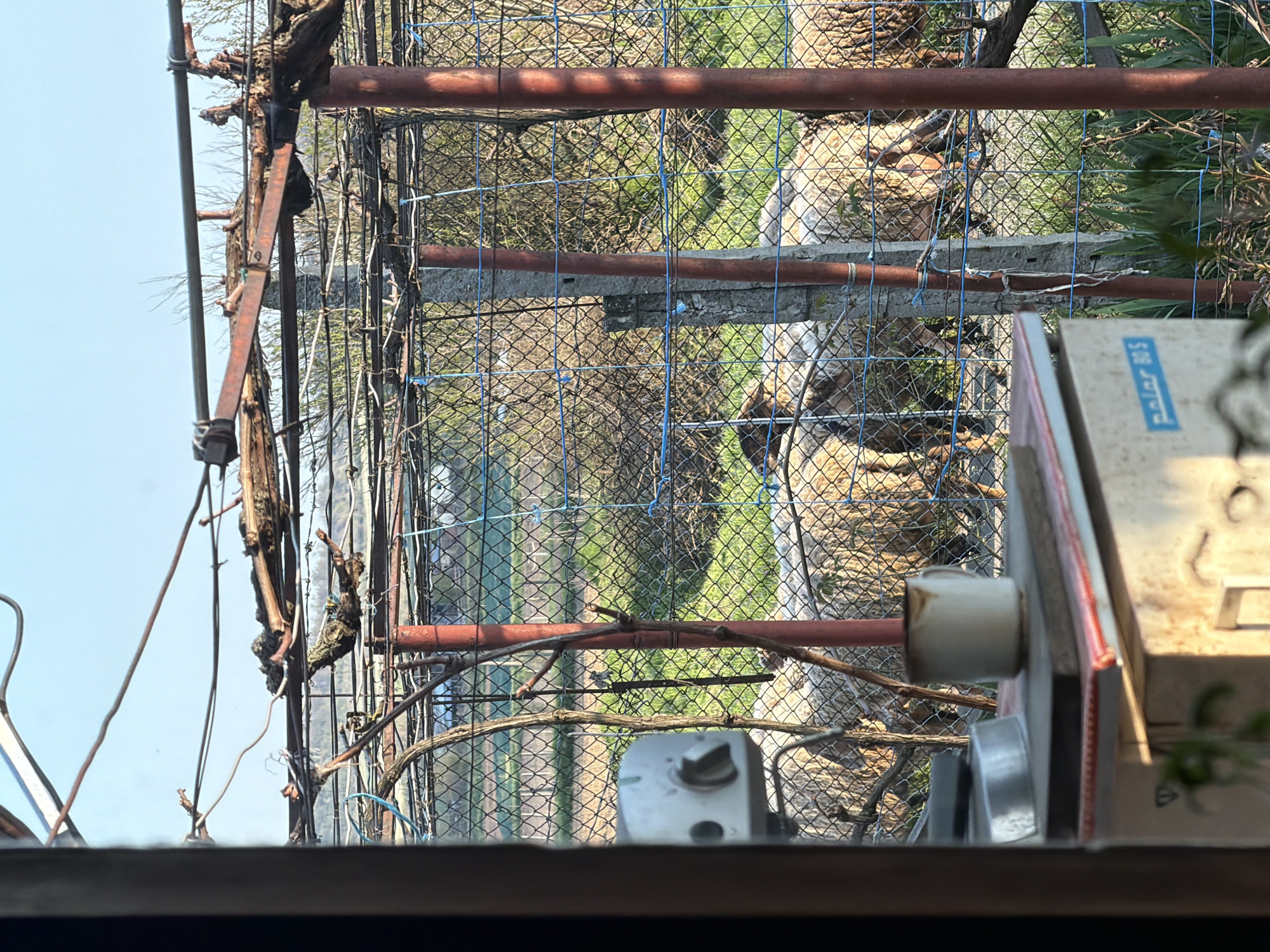view through a window in Grozdiovo, Bulgaria. A rusty metal structure supporting vines is visible. A wire fence separates the viewer from a green field. A box with the words "polar BS" on it is partially visible in the foreground.