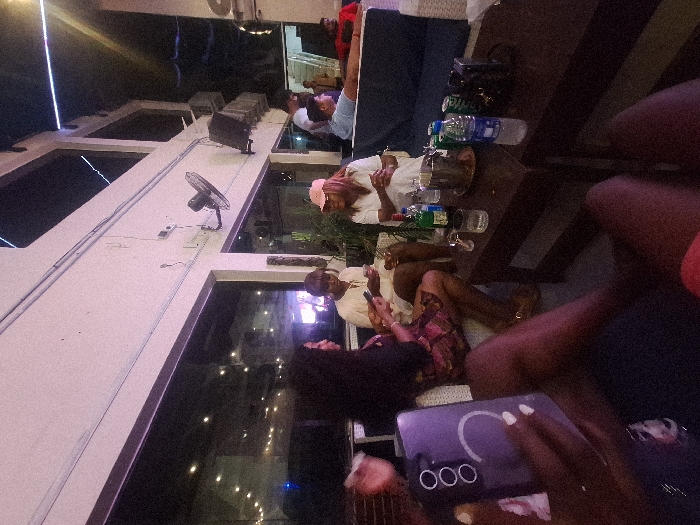 A group of people sit at a table with drinks. Some are on their phones, while others chat. The indoor setting features windows offering a glimpse of the night. A ceiling fan spins above, attached to a white wall. The table holds various items, including an ice bucket and bottles. The angle of the image is rotated.