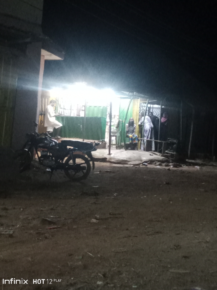 At night, a motorcycle sits in front of a brightly lit shop. A person in white stands behind the counter, while others gather inside. One person is seated, while others are standing near the entrance. The foreground is a dirt area, and the scene is captured in a dark environment. The "Infinix HOT 12 PLAY" watermark is visible at the bottom left.