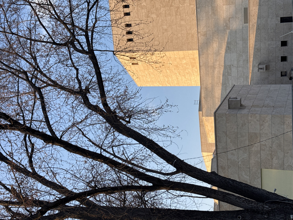 The image displays a large building in Sofia, Bulgaria, identified as a section of the National Palace of Culture (NDK), partially framed by bare deciduous trees. In the foreground, dark, leafless tree trunks and branches crisscross against a clear, light blue sky. A thin, dark cable descends vertically from a tree branch near the image's center-left. The building, occupying the midground and background, is clad in light-colored stone or tiles, appearing warm beige due to direct, low-angle sunlight which casts distinct shadows. Its architecture is composed of large, geometric, stepped blocks. The uppermost visible section on the right features a horizontal row of small, dark, recessed rectangular openings near its top. Lower sections of the building include a small, box-like protrusion with a slanted underside and another, smaller similar feature with an adjacent rectangular vent opening. A metallic ladder-like object is visible on a flat roof section in the upper midground. No individuals, actions, or interactions are present. The bare trees and specific lighting suggest a period of late autumn, winter, or early spring.