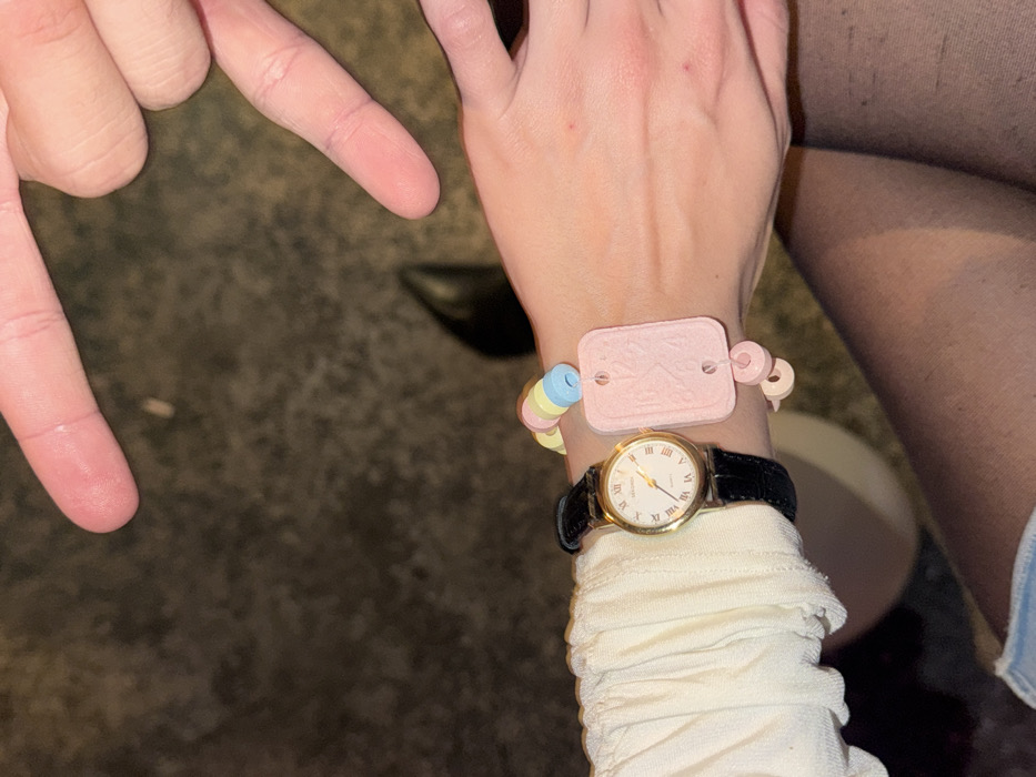 A person's arm is angled with two fingers in the frame. The wrist has a gold watch with a black leather band and a pastel-colored beaded bracelet with a pink rectangular charm. The sleeve of a light-colored garment peeks out below the watch. The background is dark and blurry, with a suggestion of other objects and surfaces in the frame.