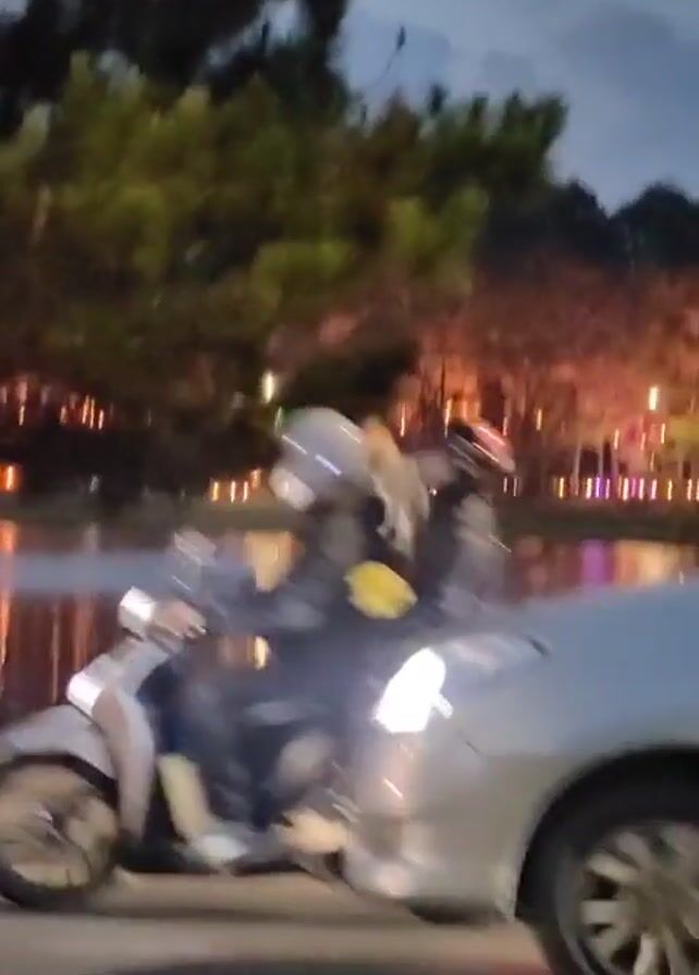 person walking along a sidewalk near a body of water, at night. The person is dressed in dark pants, a light-colored jacket with a dark hood, and a dark hat, and appears to be reading something. A silver minivan passes by on the road next to the sidewalk. The body of water reflects lights from the opposite shore, creating an illuminated effect. Trees are visible in the background along the shore.