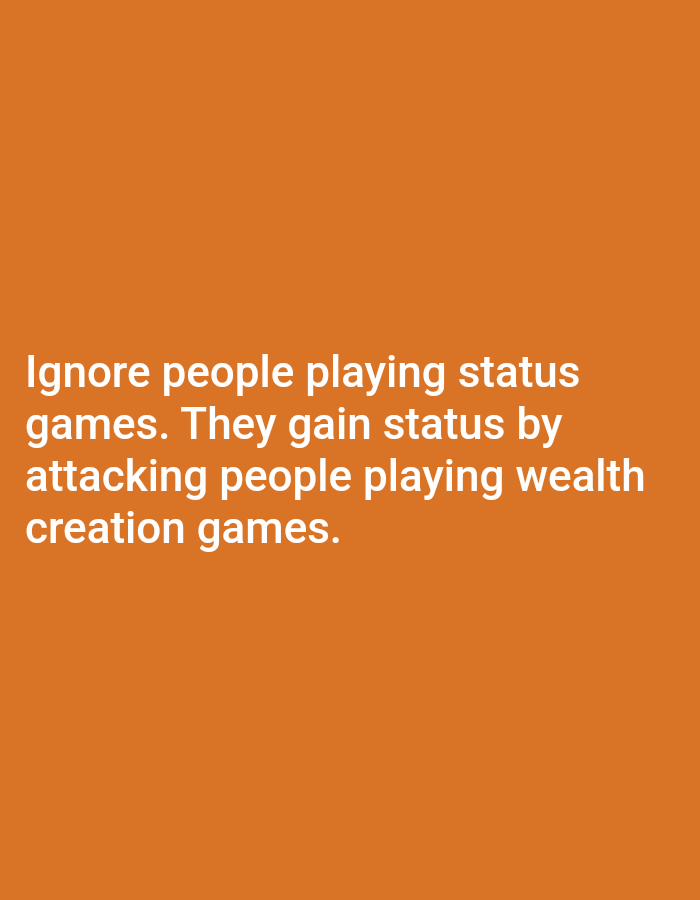 The image features a quote against an orange background. The quote advises ignoring those who play "status games," as they achieve status by attacking individuals involved in "wealth creation games." The text is rendered in white, bold font. The message implicitly favors wealth creation over status seeking.