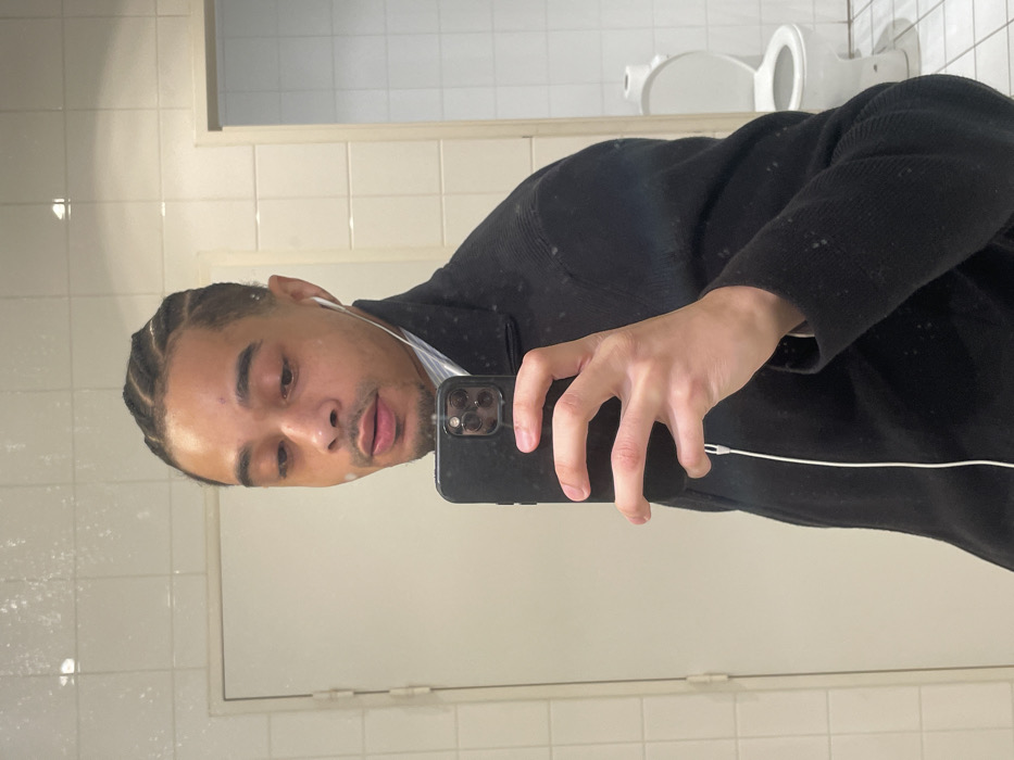 The image displays a male individual, appearing to be of mixed ethnicity, taking a mirror selfie in what is identifiable as a restroom