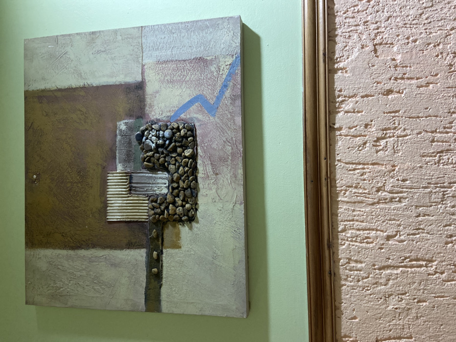 A square abstract artwork hangs on a light green wall. The piece features a textured surface with brown, beige, and cream-colored blocks. Small rocks are arranged in a vertical column and horizontal bars, and an upward-pointing blue line is painted in the upper right section. A gold-colored framed picture or mirror is situated to the right on a peach-colored textured wall.