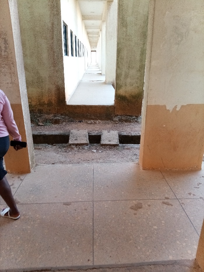 An outdoor scene in Durimi, Nigeria, depicts a partially visible individual in the foreground and a long, receding concrete corridor in the background