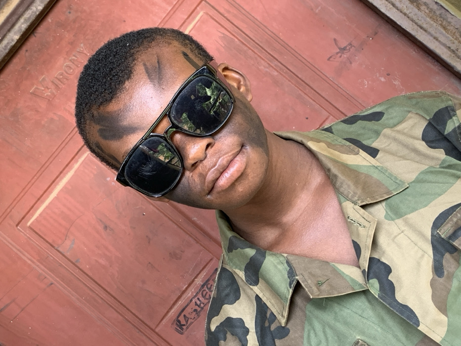 An individual, likely male, is depicted in a close-up, chest-up shot against a reddish-brown wooden panel door in Ikorodu, Nigeria