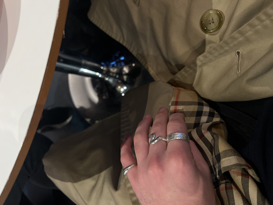 The image displays a close-up, first-person view of a seated individual's lap and left hand in an indoor environment. The left hand, positioned on the lap, exhibits three silver rings: one on the ring finger, one with a wavy design on the middle finger, and one on the index finger. The subject is wearing a beige trench coat, identifiable by its visible Burberry Nova Check plaid lining near the collar area. A light brown, four-holed button is visible on the right lapel of the coat. Dark-colored clothing is partially visible beneath the trench coat. A white table surface with a brown trim occupies the upper portion of the frame, underneath which a reflective chrome table base is visible, reflecting ambient light. There are no identifiable visual markers within the image to specify a location within Glasgow, United Kingdom.